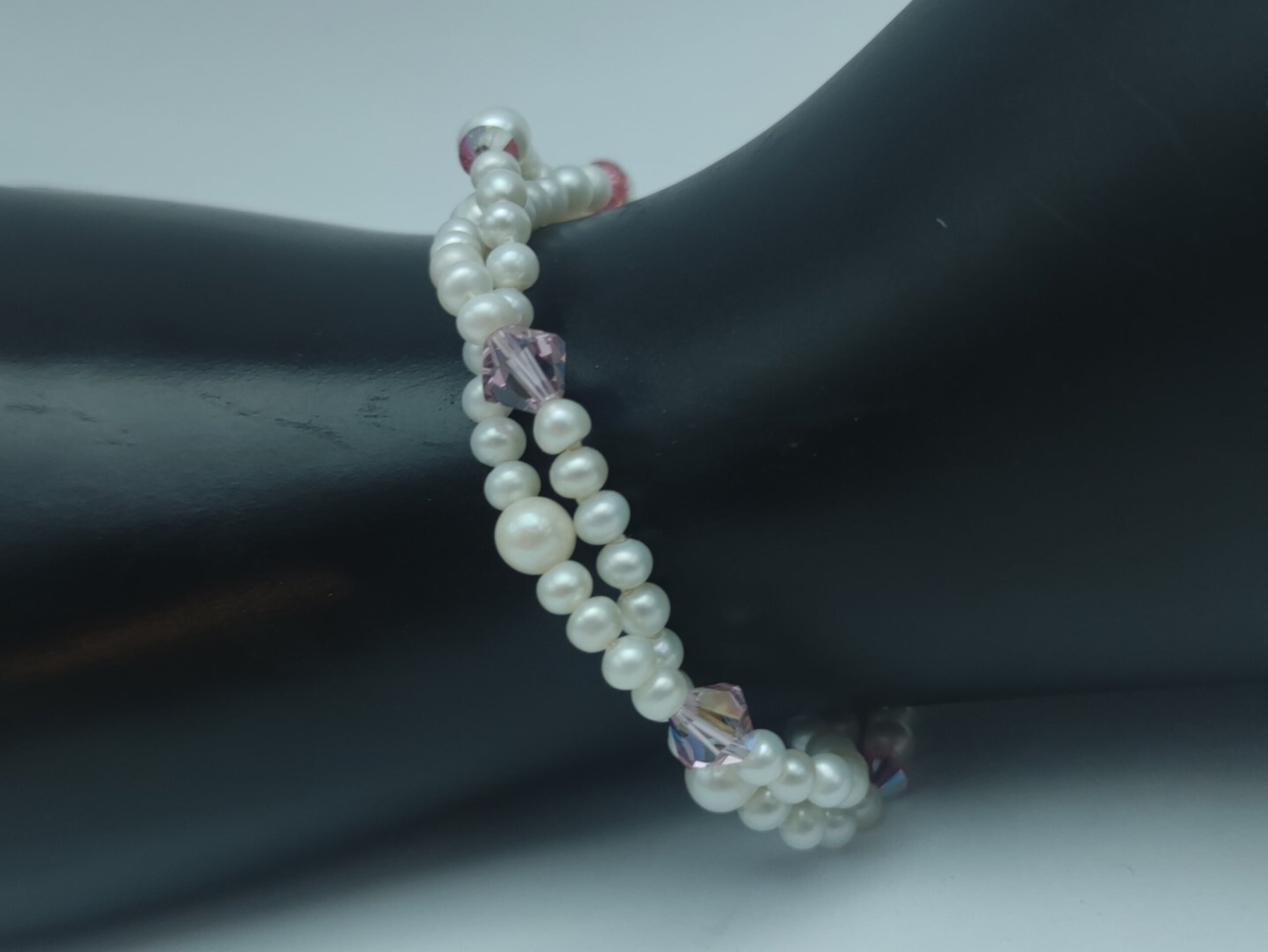 Nuestra pulsera está hecha con dos hilos de perlas de 3mm y 6mm y cristales Swarovski rosados. Además, está acabada con un cierre de bola de plata de ley rodiada.