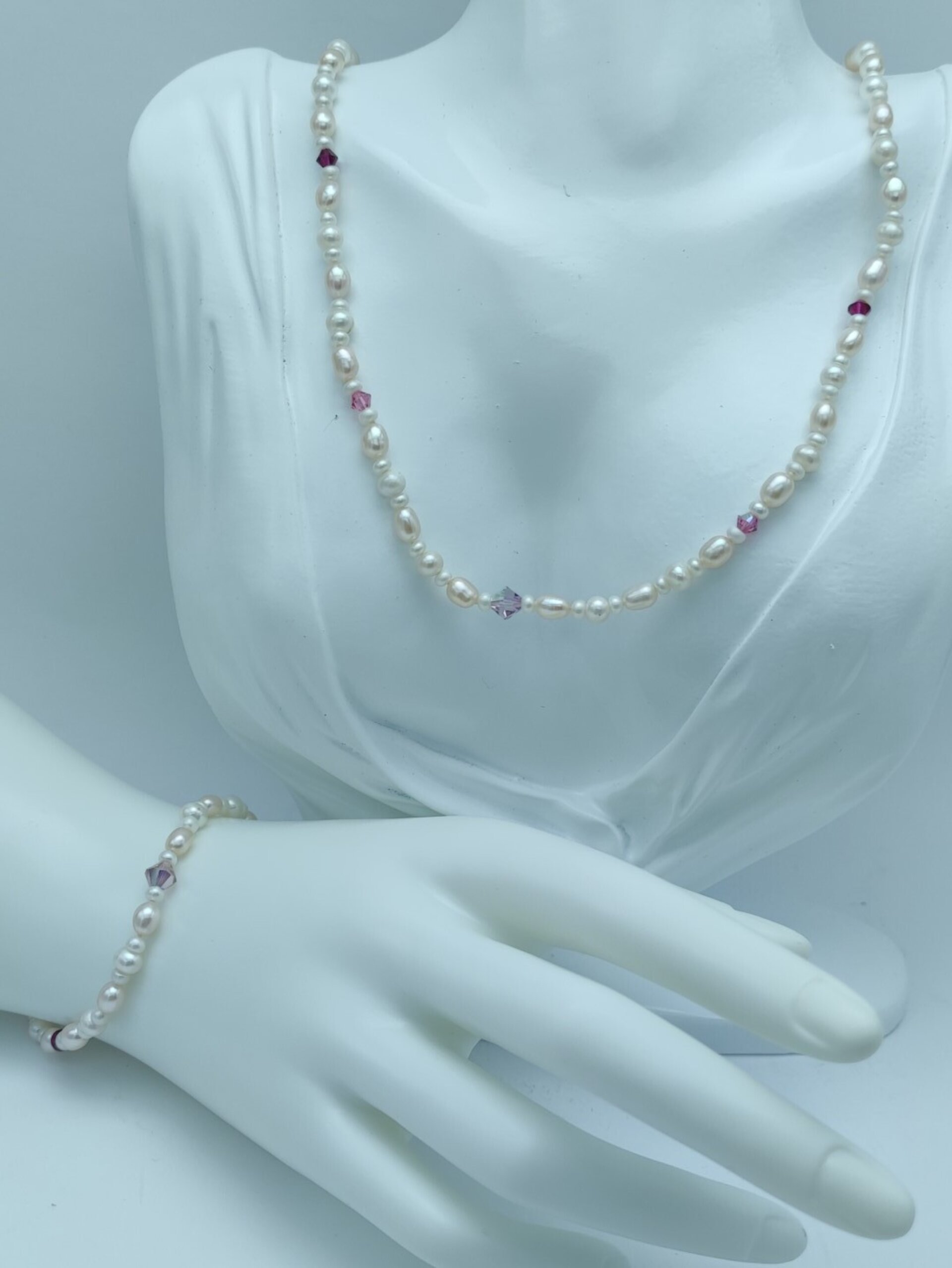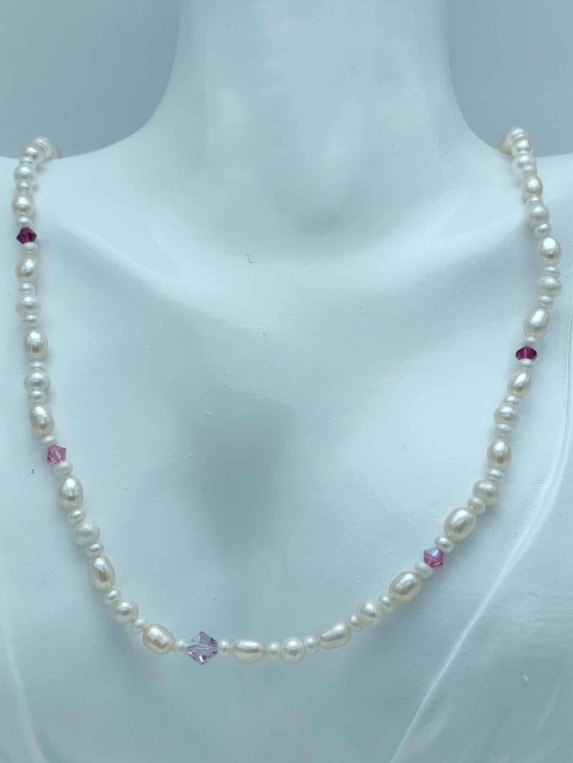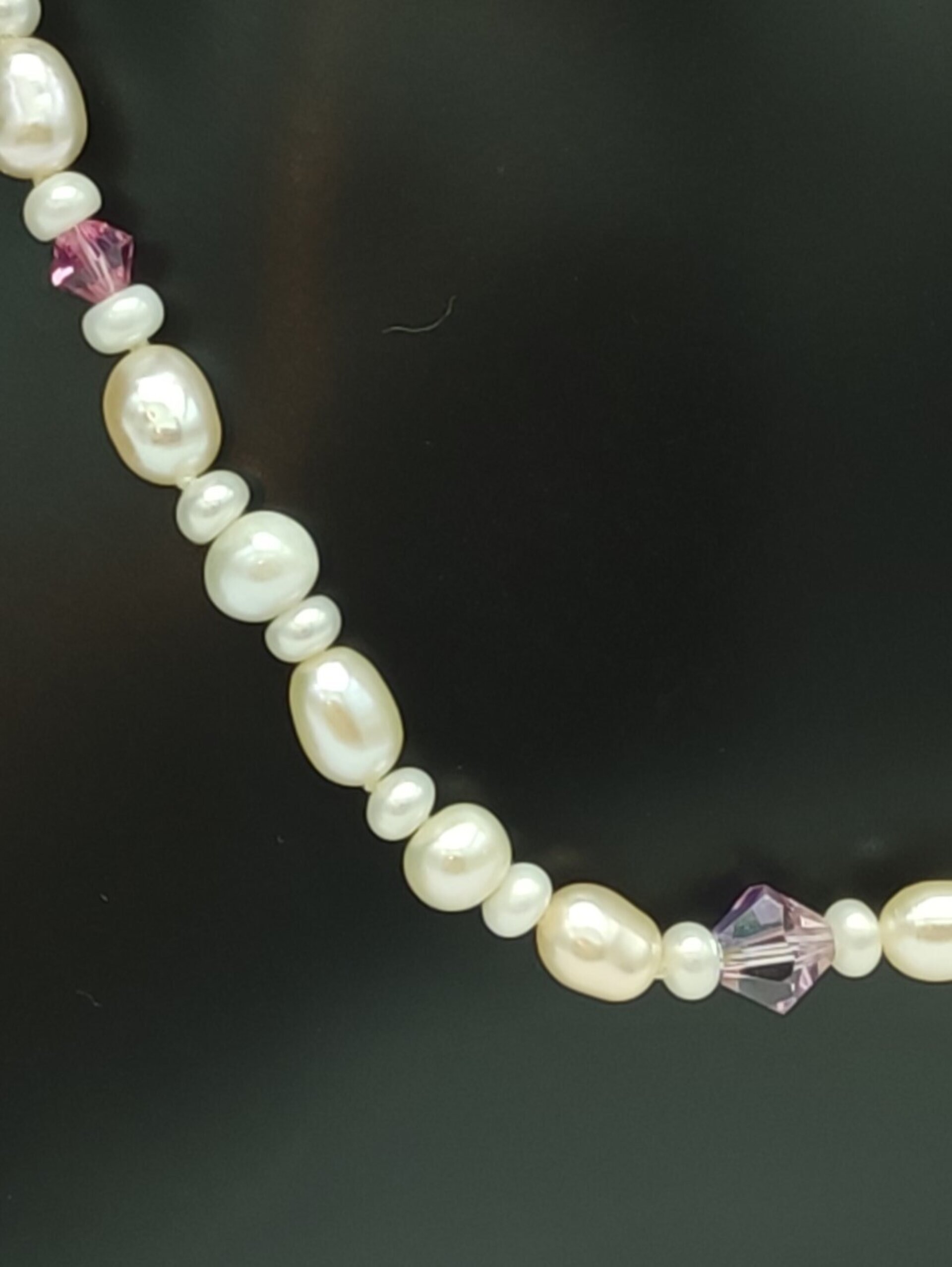 Este diseño exclusivo combina perlas de arroz de 7 mm, perlas redondas blancas de 5 mm y perlas blancas de 3 mm, todas intercaladas para crear una pieza delicada y única. Además, hemos agregado cristales Swarovski lila